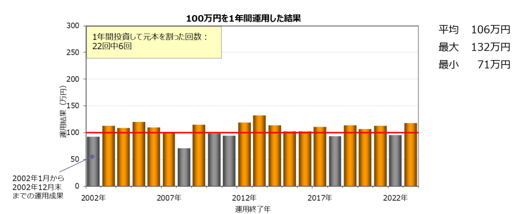 100万円を1年間投資して運用した場合は、リターンが元本よりも低くなってしまっている。