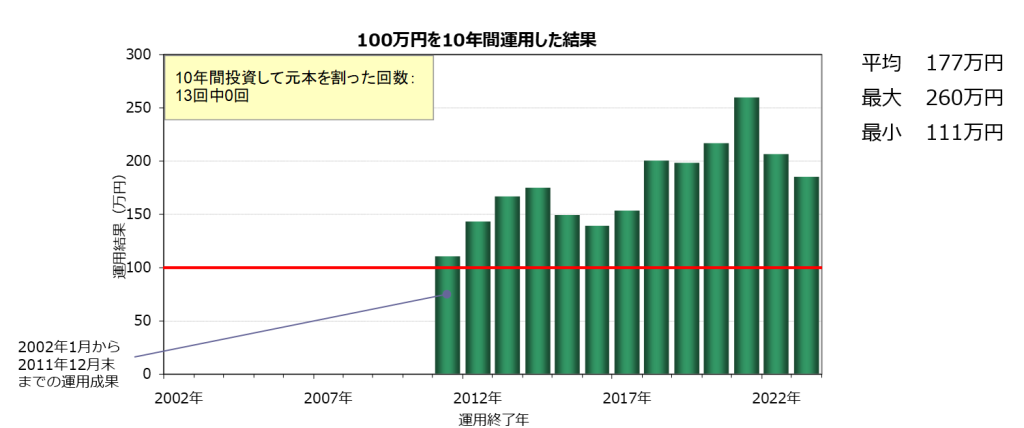 100万円を10年間投資を続けた場合は、利益と損益が相殺されて、リターンが元本より低くなったことはない。